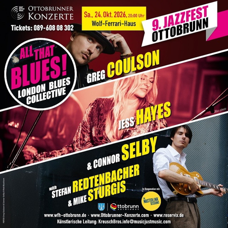 „ALL THAT BLUES“ – Das 9. JAZZFEST OTTOBRUNN steht heuer ganz im Zeichen des Blues. Mit dem LONDON BLUES COLLECTIVE, GREG COULSON, JESS HAYES und CONNOR SELBY kommen einige der innovativsten und aktuell gefragtesten englischen Bluesmusiker*innen nach Ottobrunn. Der Blues-Sänger und Gitarristen Connor Selby hat sich bereits in die Herzen des Ottobrunner Publikums gespielt. Connor Selby wurde drei Jahre in Folge bei den UK Blues Awards zum „Nachwuchskünstler des Jahres“ gewählt. Connor spielte bereits im Wembley-Stadion als Vorband für The Who, teilte sich die Bühne mit Top-Acts wie Pearl Jam, Stereophonics und Johnny Marr im Londoner Hyde Park und war auf Tournee mit Blues- und Rockgrößen Robert Cray und Beth Hart. Greg Coulson ist ein musikalisches Kraftpaket – ein ausdrucksstarker Singer-Songwriter und dynamischer Performer, der Soul und Classic Rock mit dem Groove von Blues, Funk und Jazz verbindet. Bekannt für seine fesselnde Bühnenpräsenz und seinen unverwechselbaren Sound, hat sich Greg schnell als einer der kreativsten und vielseitigsten Musiker Großbritanniens etabliert. Neben seiner Solokarriere hat Greg mit einigen der größten Legenden der Branche zusammengearbeitet, darunter der ikonische Burt Bacharach. Mit seinem Hintergrund im Londoner West End begeistert er das Publikum durch seine energiegeladenen Hammond-Orgel-Soli, seine ausdrucksstarken Songs und seine soulige Stimme. Jess Hayes aus Süd-London ist die kraftvolle Leadsängerin der Band Connolly Hayes, die für ihre elektrisierende Mischung aus Soul, Blues und Rock bekannt ist. Mit einer Stimme, die oft mit deren von Stars wie Bonnie Raitt und Susan Tedeschi verglichen wird, begeistert Jess das Publikum mit roher Emotion, Energie und einer magnetischen Bühnenpräsenz, die weltweit Menschen in ihren Bann zieht. Ihr Durchbruch gelang ihr mit einem spektakulären 4-Buzzer-Dreh bei ITV’s "The Voice", bei dem ihre atemberaubende Blind Audition die Jury sprachlos machte und den Beginn eines spannenden neuen Kapitels in ihrer bereits beeindruckenden Karriere markierte. Ob als Frontfrau von Connolly Hayes auf Tour oder im Studio – Jess Hayes sprengt Grenzen, erntet Lob und wird regelmäßig mit den größten Stimmen unserer Zeit verglichen. Stefan Redtenbacher vereint mit seinem London Blues Collective fünf herausragende britische Blues-Künstler*Innen. Verbunden durch die Masterlink Sessions und ihre gemeinsamen Wurzeln in der pulsierenden Londoner Blues-Szene, sorgen Jess Hayes, Connor Selby, Greg Coulson und der Schlagzeuger Mike Sturgis zusammen mit dem Bassisten und Produzenten Stefan Redtenbacher für ein Blues-Feuerwerk als Höhepunkt des Abends. Jeder von ihnen hat sich als Stern der britischen Blues-, Soul- und Roots-Musik etabliert. Zusammen bilden sie ein außergewöhnliches Ensemble – angetrieben vom US-amerikanischen Schlagzeuger Mike Sturgis, der bereits mit Größen wie David Bowie, Elton John, Tom Jones, Wishbone Ash oder Bono zusammen gearbeitet hat. Bandleader Stefan Redtenbacher ist ein Groovebassist mit einer großen Liebe für Jazz, Soul, Blues und Funk. Mit seinem Funkestra ist er mit Funk-Legenden wie Fred Wesley, ‘Doc’ Kupka, Lee Thornburg und den New Heavies aufgetreten. Als Unternehmer betreibt Stefan Redtenbacher sein Indie-Label RSB Records und ist Mitbegründer von KnowledgeRocks Ltd, einem Unternehmen für Musikbildungstechnologie.